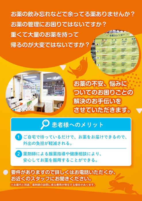 また、在宅訪問にも積極的に取り組んでおりまして、介護施設への薬のお届け、個人宅への薬のお届けもさせていただくことができます。服用カレンダーを使用して管理させていただきますので飲み忘れ防止に非常に役立ちます。