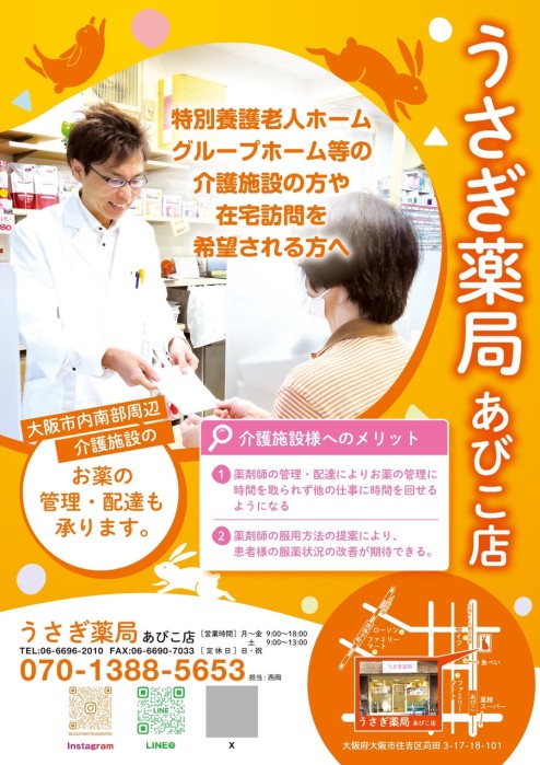 うさぎ薬局あびこ店では介護施設のスタッフの方々の負担を減らせるよう努力しております。