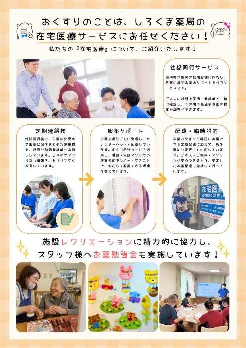 介護施設の利用者さんに薬剤師がお薬をお届けし管理します。医師の往診に同行することで副作用が出ていないか等の健康状態をチェックします。