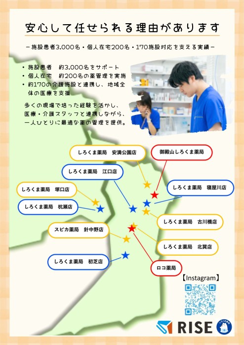 約30の施設に対応し、1000名を超える患者さまをサポートしている在宅医療に特化した店舗です。 外来とは異なるかたちで患者さまや施設スタッフさまに寄り添った対応ができるのも大きな魅力です。